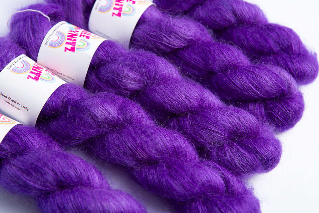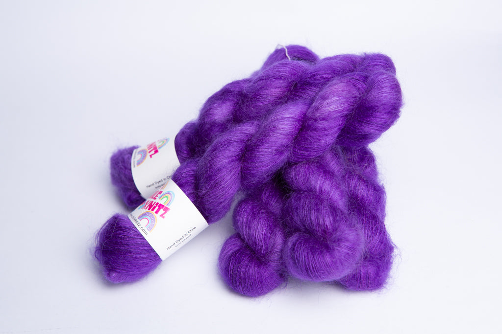 Teñida en la base Fluffy Lace 65% Kid Mohair 35% Seda. Este hilado destaca por su brillo al tener un alto contenido de seda y por la suavidad y abrigo que agrega el Kid Mohair.