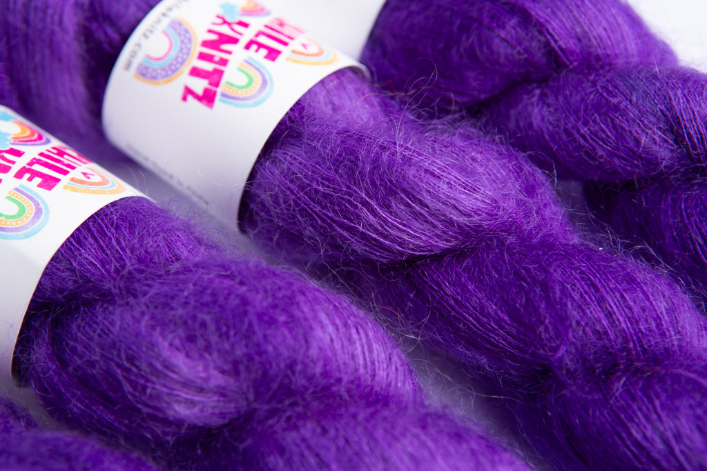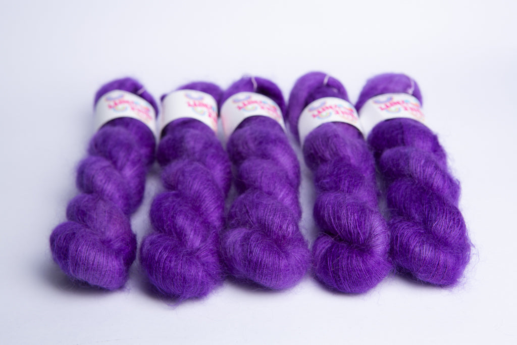 Dyed up in the Fluffy Lace 65% Kid Mohair 35% Silk. This base is a lace weight yarn. Its high quantity of silk gives it a lovely shimmer and the kid mohair adds warmth and softness to all your knitz!